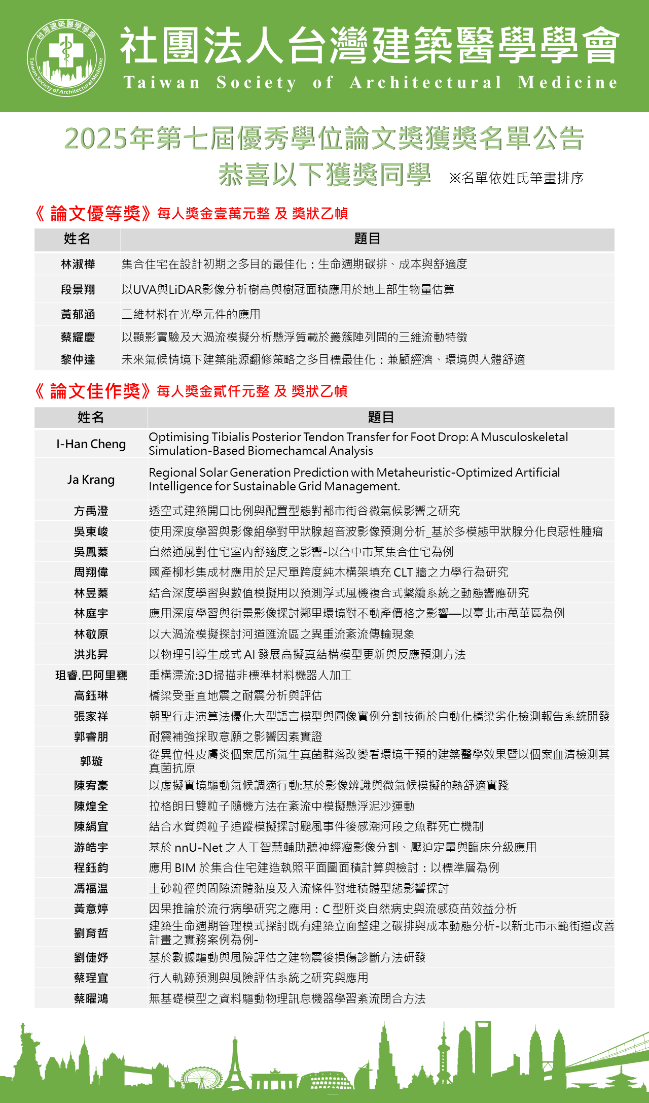 敬請獲獎學生填寫Google表單「社團法人台灣建築醫學學會2025年第七屆優秀學位論文獎頒獎典禮出席調查」,表單連結:https://forms.gle/sP5xB2wzJH7NwoFF9